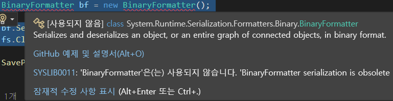그 수단으로 먼저 BinaryFormatter를 써보기로 했다.