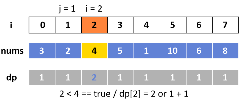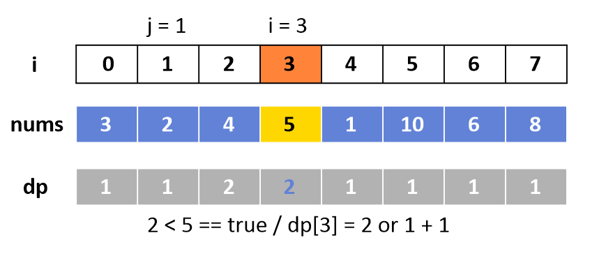 nums[ i ] > nums[ j ] 이라면 dp[ i ] 를 기존의 dp [ i ] 값 또는 dp[ j ] + 1 값 중 더 큰 쪽을 저장한다.