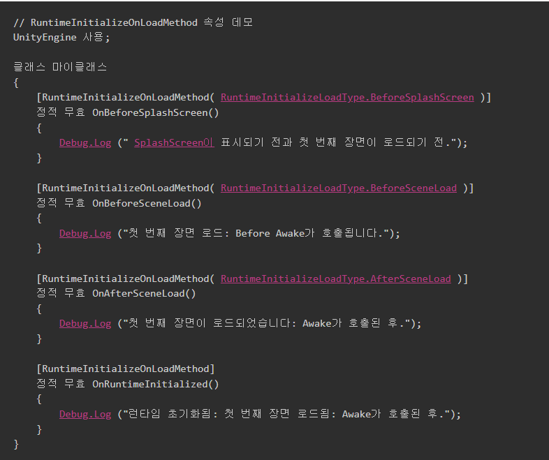 - 파라미터로 RuntimeInitializeLoadType을 받으며 실행 순서를 정할 수 있다. (기본은 Awake 이후이다.)