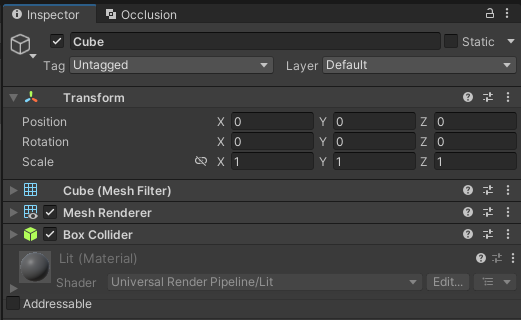 예시를 위해 테스트용 클래스를 컴포넌트로 부착시킨 큐브를 가져다 놓았다.