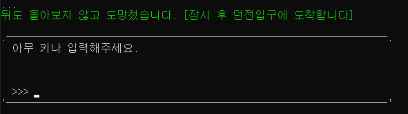 UI.ColoredWriteLine("\n뒤도 돌아보지 않고 도망쳤습니다. [잠시 후 던전입구에 도착합니다]",ConsoleColor.Green);