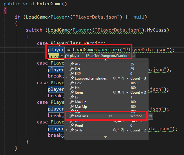 switch (LoadGame<Player>("PlayerData.json").MyClass)