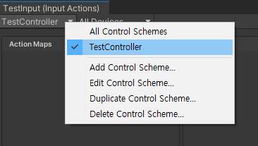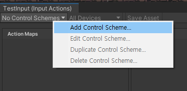 생성된 InputAction을 켜주고 Control Scheme를 추가시켜준다.