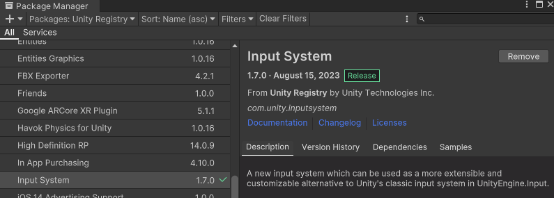 InputSystem을 쓰기위해 패키지 매니저의 InputSystem 설치가 필요하다.