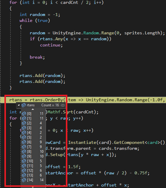 즉, while문을 잠깐 생략하고 현재 16 / 2 = 8 : 전체카드수 / 절반 = 필요카드(스프라이트) 수 만큼 루프하며 rtans List에 int 값을 할당 할 것이다.
