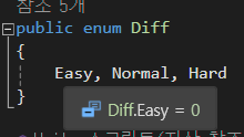 enum에 적어놓은 Easy에 마우스 커서를 가져다 대어보면 0 이 할당되어 있는것을 볼 수 있다.