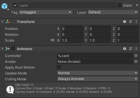 실행하기전 Card 프리팹에서 Animator 컴포넌트를 비활성화 시키자. Card가 생성되자마자 Idle 애니메이션이 실행되는것을 방지 하기 위함이다.