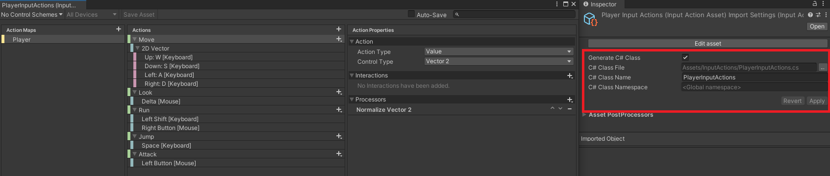 Player 오브젝트에 부착되는 PlayerInput 클래스는 방금 만들어준 InputAction의 C# 클래스 정보를 가지고 있다.