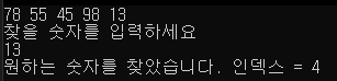 Console.WriteLine($"원하는 숫자를 찾았습니다. 인덱스 = {index}");
