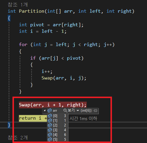 left == 0, right == 5 이므로 if 문의 첫 줄인 Partition 함수가 실행된다.