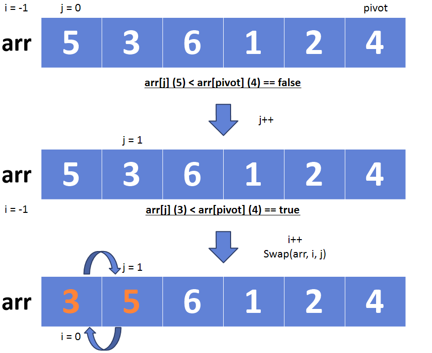 for 문을 루프 해 배열의 각 값[ j = 0 ~ 5 (j < arr.Length - 1) ] 을 pivot 과 비교한다.
